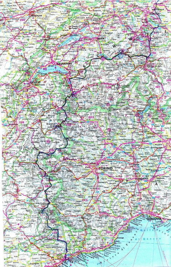 Peter, vor 23 Jahren sind wir zusammen von Stein/Rh. in sieben Tagen nach Nizza geradelt, unten die alte Karte von damals mit der eingezeichneten Route und den Etappenorten