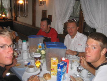 Jens Heppner und rechts Shootingstar Tim Klinger, der im nächsten Jahr beim Team Gerolsteiner angeheuert hat, beim Frühstück, ganz links das müßte Robert Retschke sein