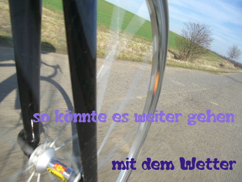 .......in 20 Jahren hätte man heute jedenfalls in kurzen Hosen fahren können, kluge Leute denken aber das es mit der Klimaerwärmung ehr schneller geht. Was kann man tun?? Mehr Radfahren ist jedenfalls nicht schädlich. Denke das auch mehr Elektro getriebene Fahrzeuge in Zukunft unser Straßenbild verändern wird. Was mich dann aber nachdenklich macht ist die Tatsache das sich ein Kreisheimatpfleger wegen einem geplanten Windrädchen so anpisst, bisschen globaler denken wäre da schon nicht schlecht. so jetzt noch schnell einen Espresso bei Moritz im willsbäck coffee & more und dann gehts ab und nicht vergessen morgen ist Valentinstag.