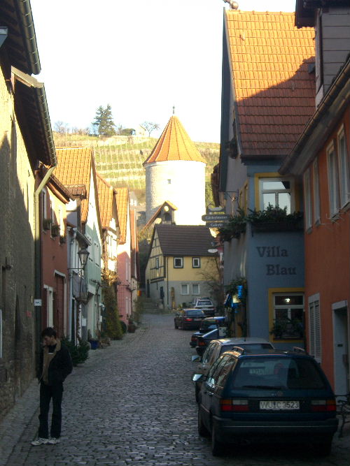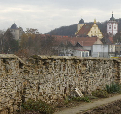 alte Mauer in Segnitz mit Blick auf die Türme von Marktbreit