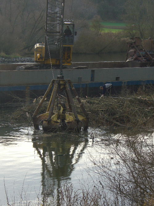 das in den Mainauen bei Frickenhausen geschlagene Holz wird per Schiffsbagger "geborgen"