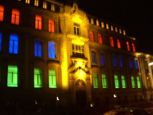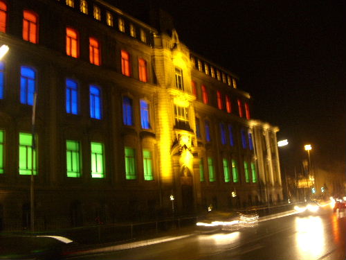 Mit der farbig illuminierten Alten Augenklinik in Würzburg beginnt die erleuchtete Wissenschaftsmeile Röntgenring von der Friedensbrücke aus